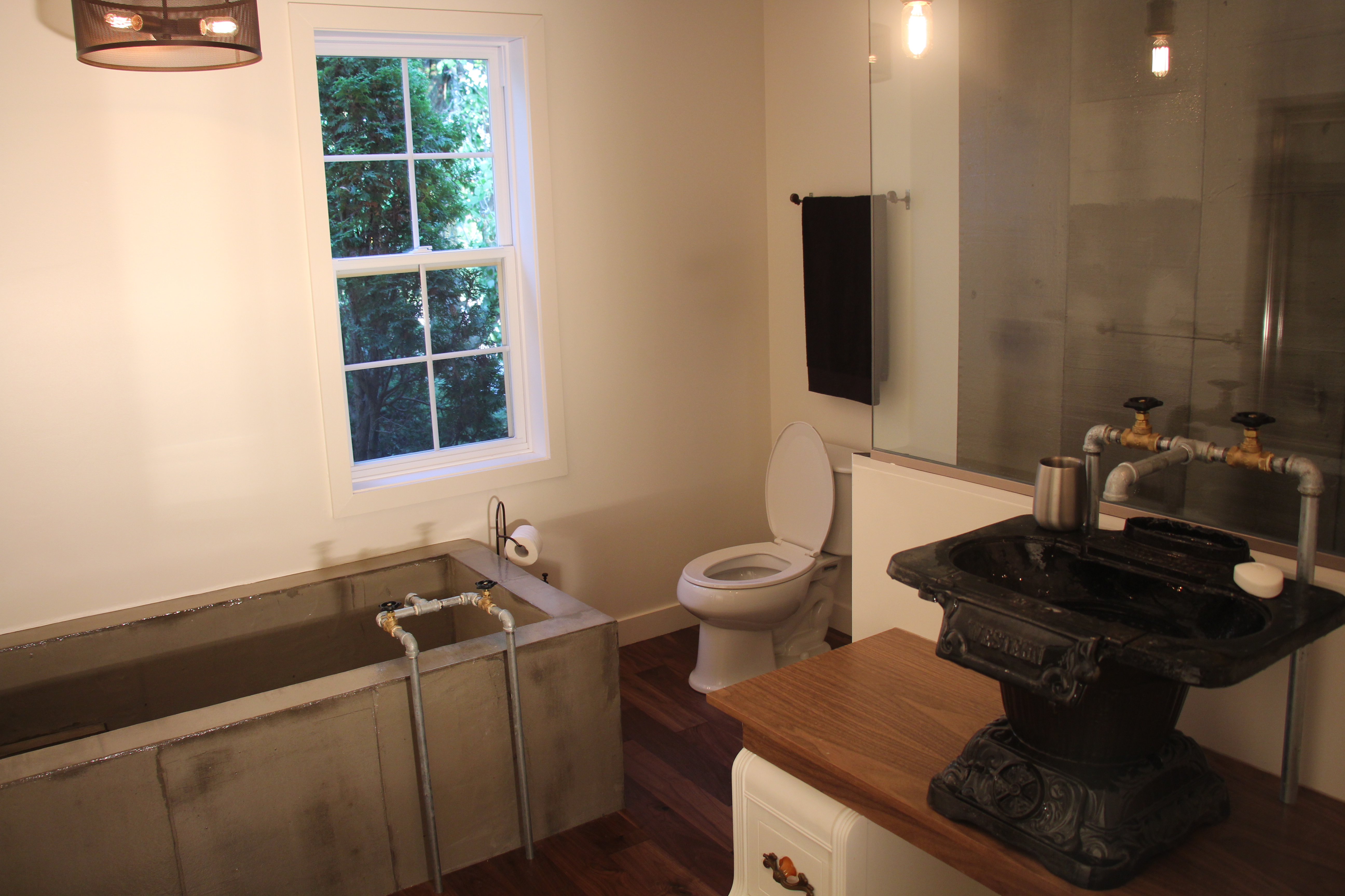 Douche et bain en béton / plancher en bois d’ingénierie (noyer)